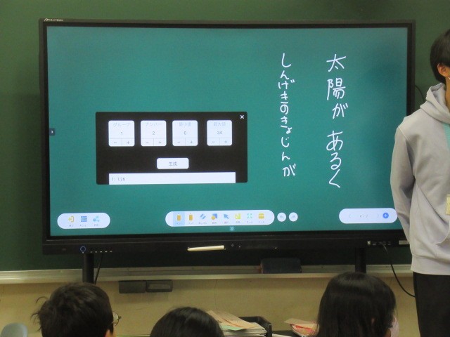 主語、述語とは何かを学習した後、短冊カードを使って面白文を作って楽しんでいました。主語だけを書くグループと、述語だけを各グループの短冊をランダムに組み合わせるのです。「太陽が歩く」などの短文に子供たちは大爆笑でした。