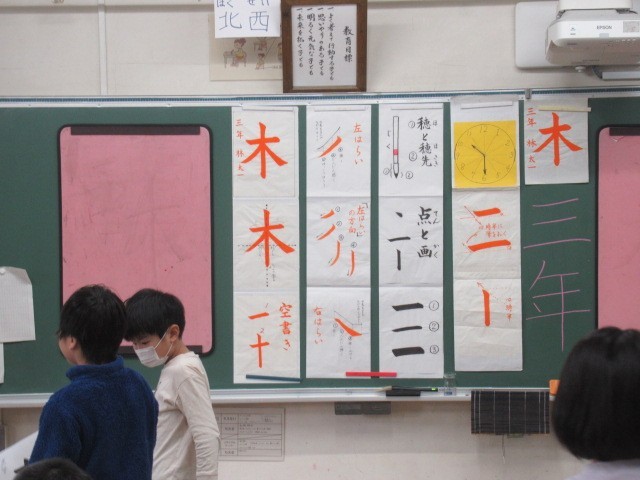 11/5 3年生 書写 公開日 2025/11/05 更新日 2025/11/05 学校生活 書いていたのは「木」の一文字です。中心を通すこと、右払い、左払いの筆遣い、そのバランスなどなかなか難しい字です。子供たちは持ち前の集中力でとてもいい字を書いていました。