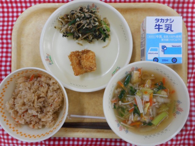 牛乳、切干大根ご飯、いかのから揚げ、磯香和え、沢煮椀