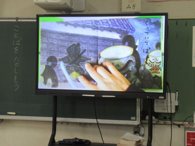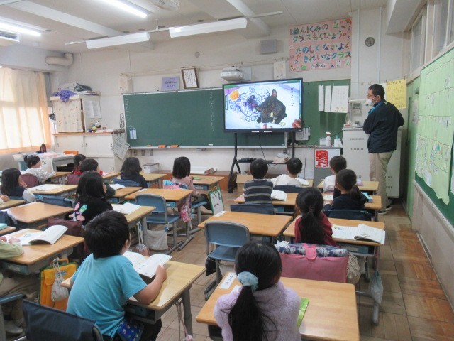 国語の授業で言葉の面白さを学んでいます。今日はその学習に合った絵本を読んでもらっていました。ニコニコ笑いながら楽しそうに聞いている様子を見て、話したり書いたりする力をつけるには言葉に興味をもつことが一番だなと感じました。