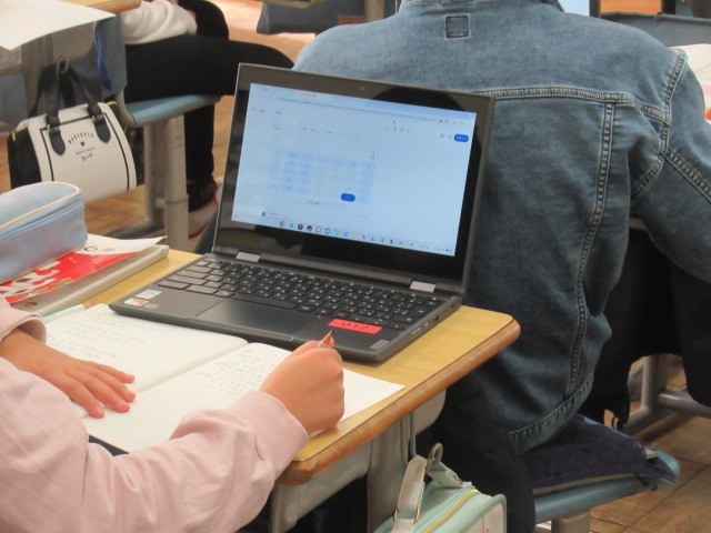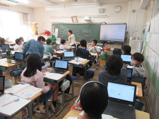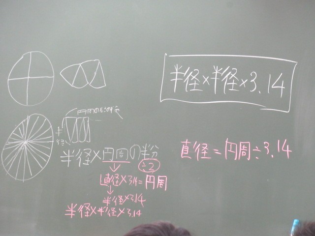 曲線で囲まれた図形の面積を求めるには、考え方に柔軟性が必要です。子供たちは円を切った形を組み合わせて、なんとか面積を求めようとしていました。(タブレットは電卓として使っています。)もちろん円の面積を求める公式はあります。でも、まず自分たちで考えることが大切です。