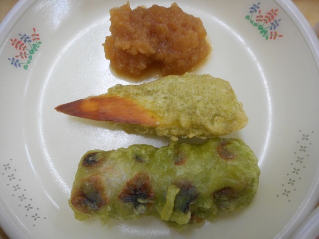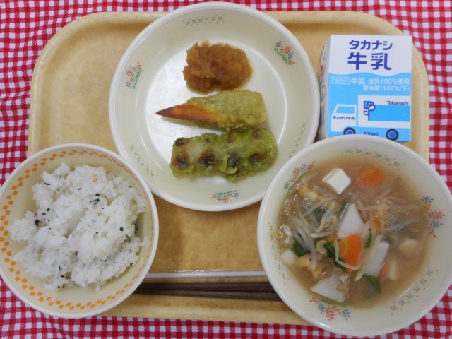 牛乳、にんじんわかめご飯、鉛筆の天ぷら、大根おろし、味噌汁