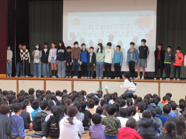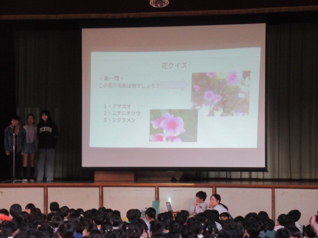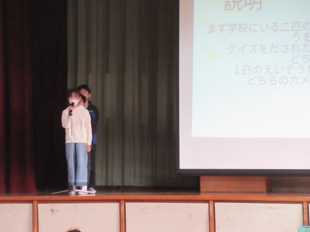 自然委員会が発表集会を行いました。委員会で世話をしているカメに関するクイズや、植物に関するクイズを出題して全校児童を楽しませてくれました。準備も大変だったと思います。ご苦労様でした。