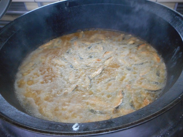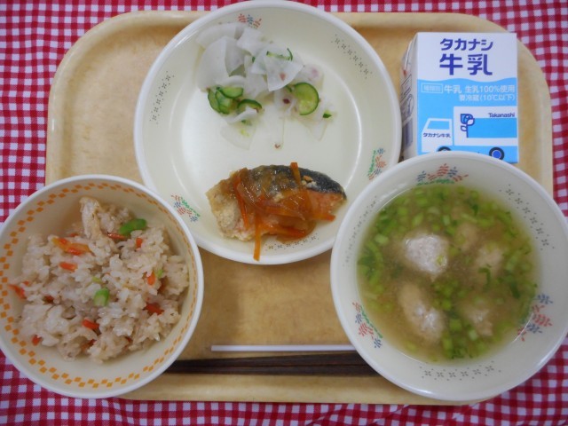 牛乳、舞茸ご飯、魚の揚げ浸し、大根の梅しそ和え、かぶのすり流し汁