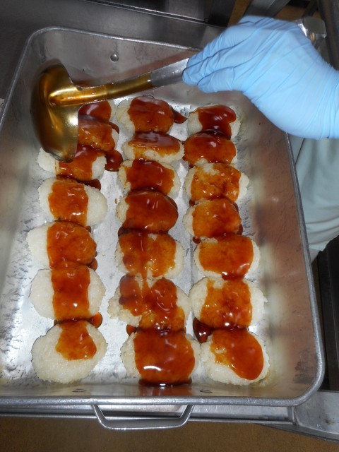 煮込みうどんに、秋の味覚である里芋、椎茸、しめじなどをたっぷり入れて、秋の煮込みうどんにしました。きのこは、食物繊維がたっぷり入って、ビタミン・ミネラルも多く、免疫機能を高めるβグルカンという栄養も多いです。五平餅は、愛知県、長野県、岐阜県などで作られたものです。ご飯をつぶして平たい形にして、たれをつけて焼いて食べます。給食では、お米ともち米を使って炊き、形をつくってオーブンで焼いた後、みたらし味のたれをかけました。楽しみにしてくれていた児童も多く、今日もご飯の粒が見える!と言いながら、もちもちの食感を味わって食べていました。くだものはみかんです。風邪予防に効果的なビタミンCが入っていることを伝えながらクラスを回りました。