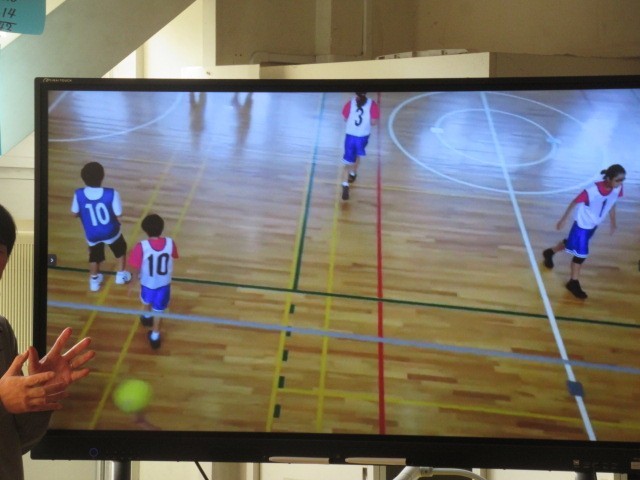 百聞は一見に如かず。まず、やってみる前に、「ポートボールとはどんなスポーツなのか」を映像で学習していました。子供たちは映像を見ながら、「こういうときはどうなるのか?」といったルールについての質問もしていました。そのスポーツをよく理解することでより楽しめるようになりますね。