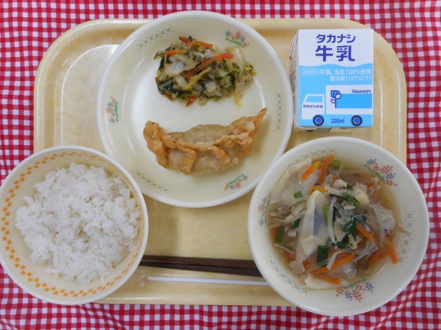 牛乳、麦ご飯、ジャンボ餃子、中華あえ、ワンタンスープ
