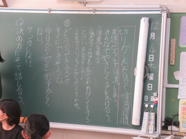 活動自体は学級活動のようですが、内容としては国語の授業です。話し合いの仕方そのものを意識しながら、それぞれが意見を出し合っています。自分の意見を述べたり、ほかの人の意見に質問をしたり、話し合いがだんだん形になっていく様子がわかりました。