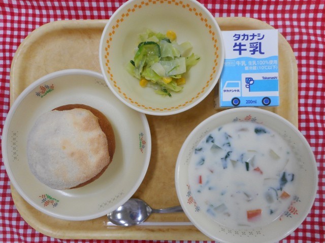 牛乳、手作りメロンパン、グリーンサラダ、クラムチャウダー