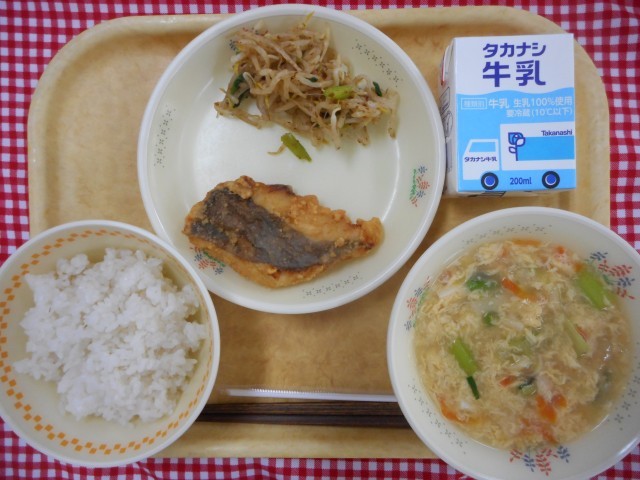 牛乳、麦ご飯、魚の竜田揚げ、おひたし、かき玉汁
