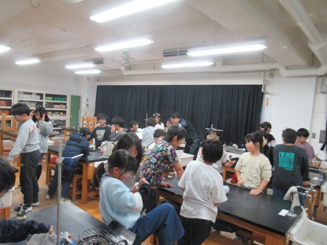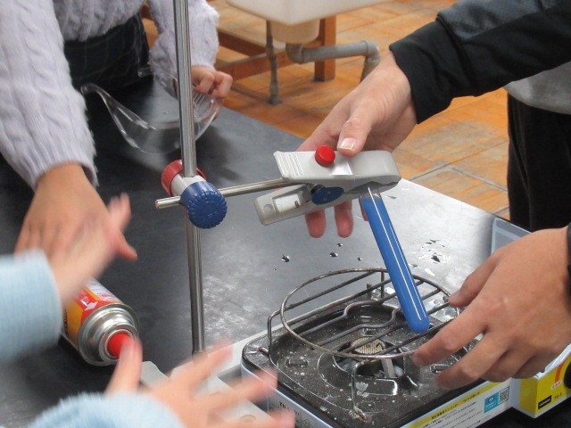 水の温まり方を調べる実験です。火を使う実験なので安全にはいつも以上に気を付けて準備を進めていました。水を入れる試験管の高さや向きなどを丁寧に微調整していく必要があります。どのグループも相談したり確認したりして安全に準備を完了することができました。