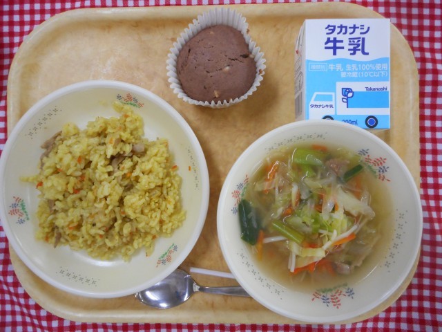 牛乳、カレーピラフ、ジュリエンヌスープ、えらんでカップケーキ(プレーン×チョコチップ〔写真上〕またはココア×ホワイトチョコチップ〔写真真ん中〕)