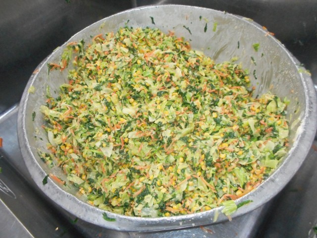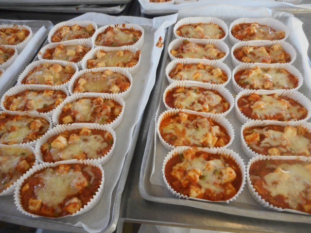 豆腐のグラタンは、野菜をトマトソースで煮て、豆腐を加え、チーズをのせて焼いたものです。さっぱりしたトマト味にチーズのコクが相まって香ばしい味に仕上がりました。紙カップの隅々まできれいにスプーンでかき集めて食べてくれていました。きょうのサラダには、町田でとれたほうれん草とキャベツを使いました。ほうれん草を食べると大きなパワーを発揮するアニメキャラクターの「ポパイ」が名前の由来です。また作ってください!という声を多く聞けて嬉しかったです。