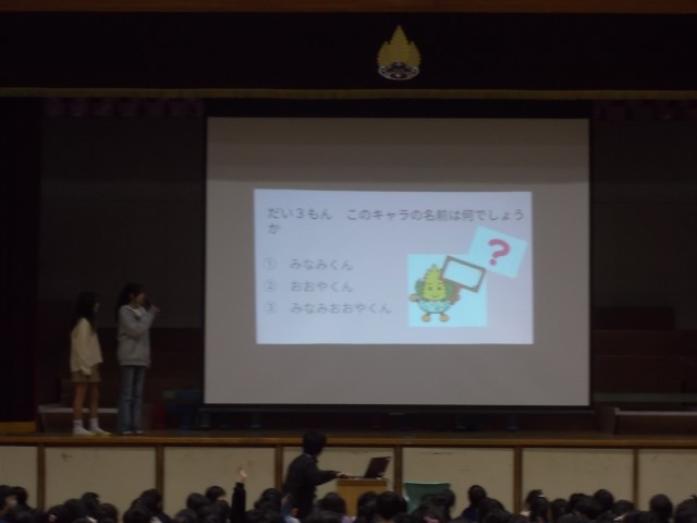 今朝は、体育館で全校集会が行われました。集会委員会の皆さんが企画してくれたのは、学校にまつわる楽しいクイズです。