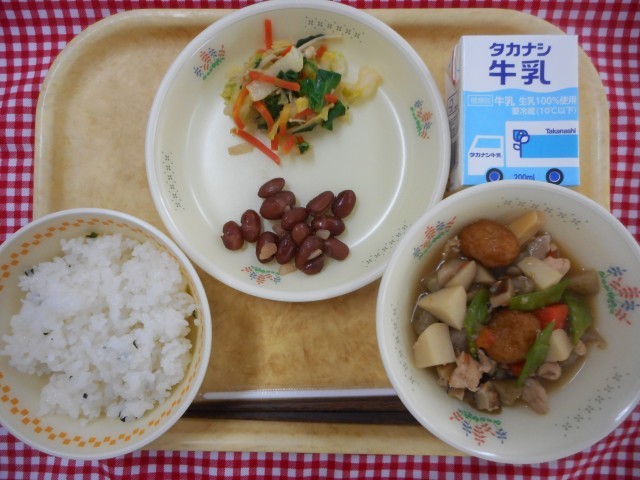 牛乳、わかめご飯、炒り鶏、からしあえ、金時豆の煮豆