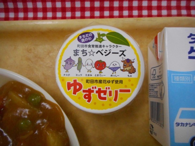 きょうは、みなさんが大好きなカレーライスです。カレーライスに使われるカレー粉は、どこの国の人が考えて生まれたものだと思いますか?カレーといえば、「インド」を思い浮かべる人も多いかもしれませんが、答えは「イギリス」です。イギリス人がインドで使われていたスパイスをヒントにカレー粉がつくられたそうです。『ゆずはちみつゼリー』は、町田市でとれた「ゆず」を使って作られています。また、ゼリーのラベルには、町田市で収穫される食材のイラストが描かれています。お米もとれるんだ!名前がかわいい!などと興味津々でした。