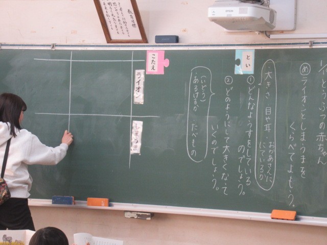 国語の授業、内容は説明文の読み取りです。説明文には「問い」にあたる部分と、それに対する「答え」にあたる部分があるということしっかりと学習していました。今日は内容を表にまとめていくようです。