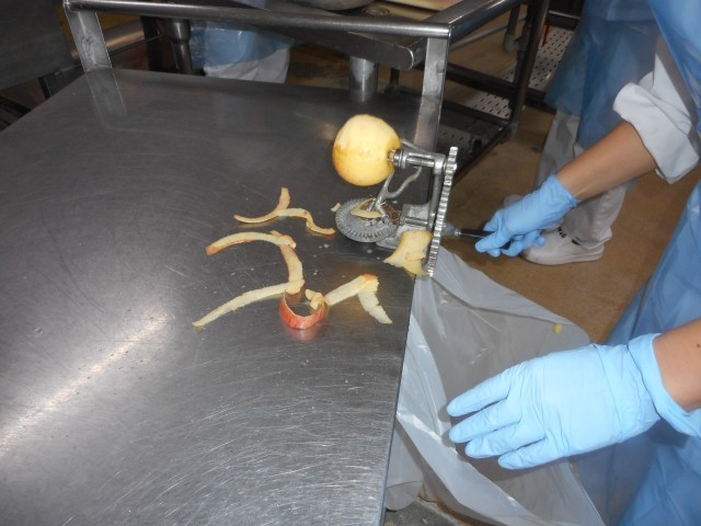 麻婆豆腐は給食でおなじみのメニューですが、すべて給食室で手作りしています。にんにく、しょうがとひき肉を炒め、玉ねぎ、たけのこ、にんじん、しいたけなどの野菜をみじん切りにして加え、あたためておいた豆腐を入れます。味付けはテンメンジャンや豆板醬、赤みそなどで調整し、でんぷんでとろみをつけ、ねぎやにらを加えたら出来上がりです。どの学年もお皿がピカピカになるまでご飯と一緒によく食べてくれていました。りんごは青森県産のサンふじです。給食室では皮むき器で一つ一つむいてからカットしています。蜜が甘くておいしかったと人気でした!