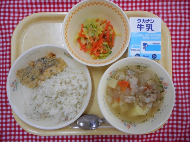 牛乳、パセリライス、魚のパン粉焼き、にんじんサラダ、ベーコンスープ
