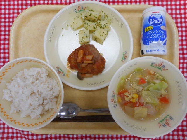 発酵乳、麦ご飯、トマトソースのハンバーグ、青のりポテト、ABCスープ