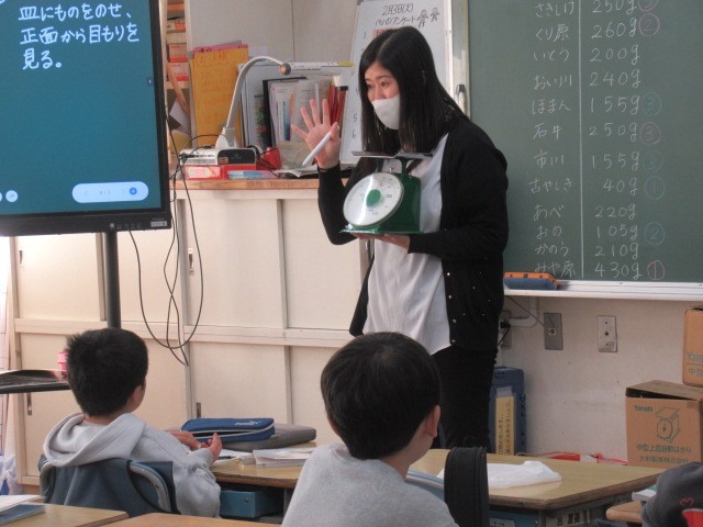 3年生 算数 重さのはかり方 公開日 2026/02/03 更新日 2026/02/03 学校生活 算数の学習です。重さは目で見ることができないので必ず何か道具を使わなければなりません。話し合いをしながら正しく測定する方法を学んでいました。