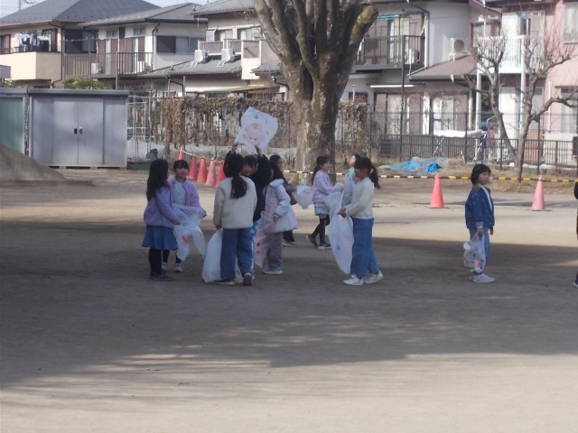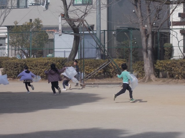 1年生が、大きなビニール袋を手に、元気いっぱい「風」と遊んでいました。