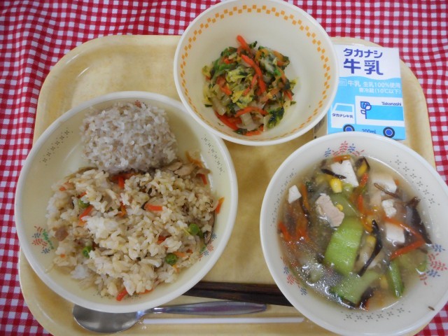 牛乳、ねぎチャーハン、真珠蒸し、中華あえ、チンゲン菜とコーンのスープ