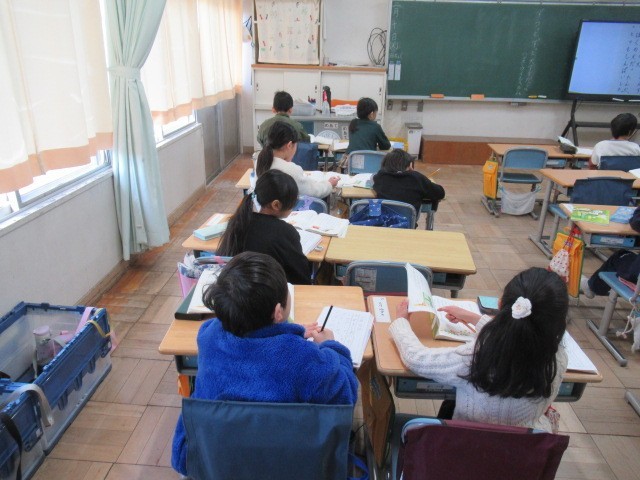 1年生の物語文の学習です。読み取る部分とその内容を絞って学習していました。学習規律もしっかりしてきており、とても落ち着いて書いたり、発言したりしていました。