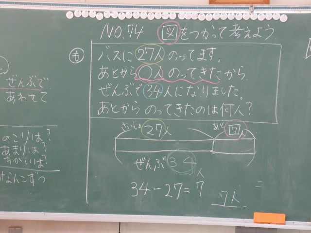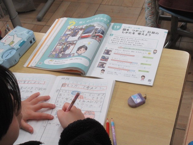 文章問題から式を立てる学習です。問題を読むとたし算になりそうだけれども実際にはひき算で答えを出すような問題もあります。そんな時に頼りになるのが「図」です。場面を図で表す力は学年が上がるにつれて重要になってきます。子供たちは、問題を一行ずつ丁寧に読んで図に置き換えていました。