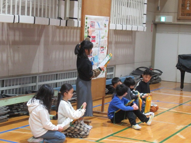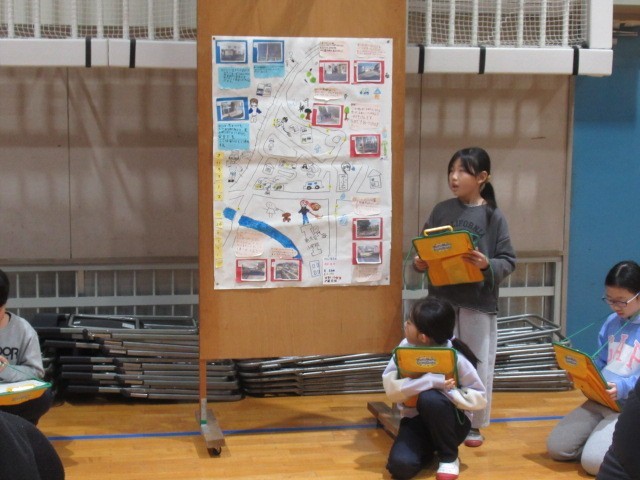 発表集会の後、そのまま体育館で発表会が行われました。各グループが自分で作った新聞を発表しています。たくさんのおうちの方にも来ていただき、子供たちは嬉しそうでした。どのグループもしっかり発表できました。