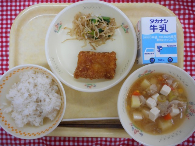 牛乳、麦ご飯、いかの更紗揚げ、おひたし、道産子汁