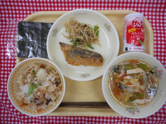 発酵乳、五目寿司、魚の竜田揚げ、おひたし、沢煮椀