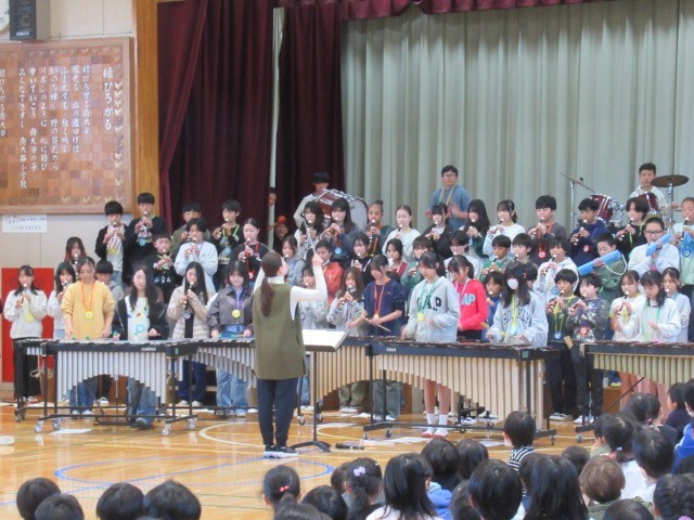 今日の3校時に6年生を送る会が行われました。各学年の心のこもった贈り物に6年生も嬉しそうでした。最後は6年生から在校生に対しての出し物。迫力のある合奏と歌で、「さすが6年生!」というかっこいい姿を見せてくれました。卒業まであとわずかですが、これからもかっこいい姿を見せ続けてください。