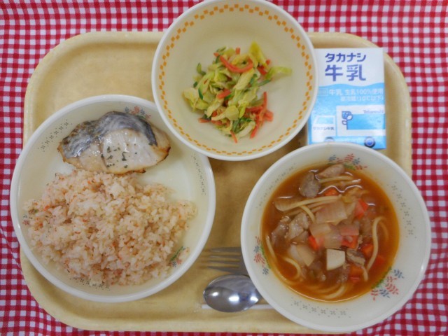 牛乳、にんじんバターライス、魚のハーブ焼き、野菜サラダわさびドレッシング、ミネストローネ