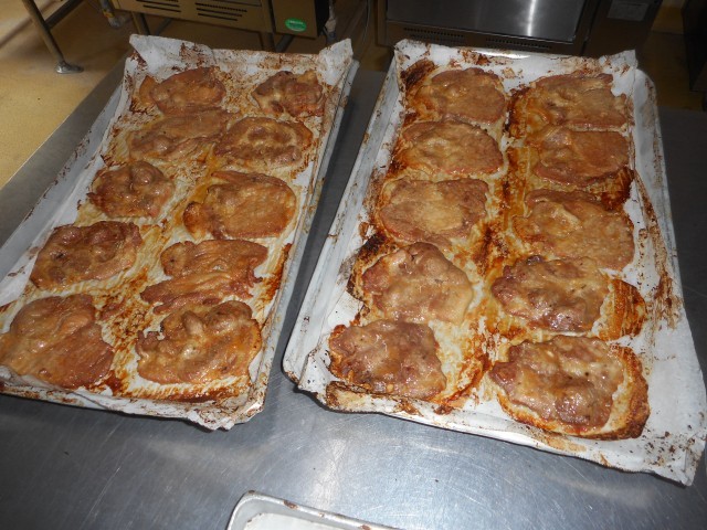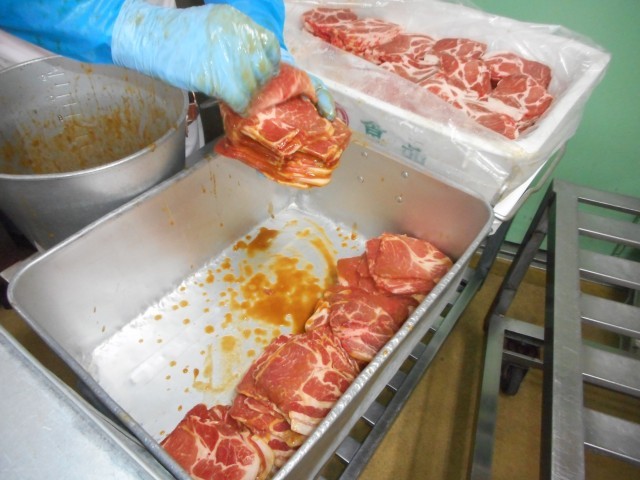 トン漬けは、神奈川県厚木市の郷土料理です。豚肩ロース肉を特製のみそダレにじっくり漬け込み、オーブンで焼きました。豚肉には、疲れをとって元気を出す「ビタミンB1」という栄養素がとても多く含まれています。また、体をつくる「たんぱく質」もたっぷりなので、じょうぶな体をつくることができます。きょうの豚肉は、赤身と脂身のバランスが良い「豚肩ロース肉」という部位を使いました。香りだけでご飯がすすむような味付けだったので、給食が運ばれるときから良いにおい!という声が聞こえてきました。薄いお肉を用意していただき、一枚一枚丁寧に下味をつけたので、とても味が染み込んでいました!