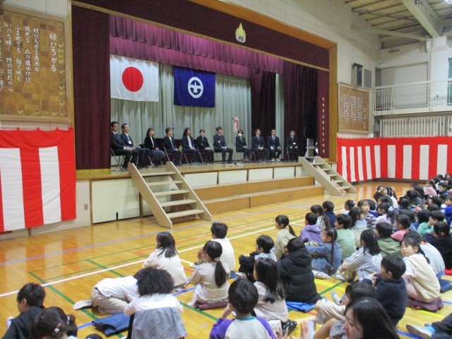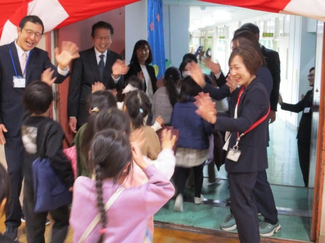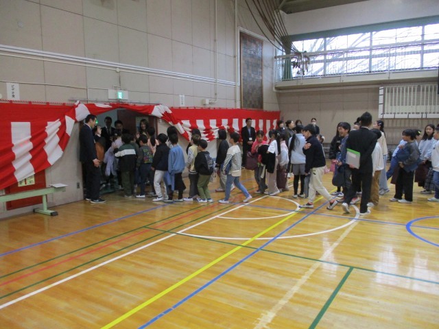 南大谷小学校では、「緑ひろがる」の合唱とともに、全校児童は体育館を後にします。 離任される先生方が体育館の出口で子どもたちと最後のお別れをしました。