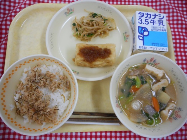 牛乳、ご飯、さけふりかけ、揚げ出し豆腐、おひたし、豚汁