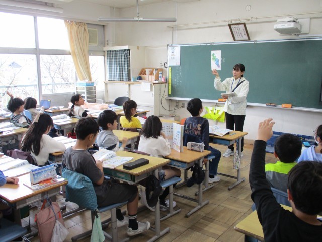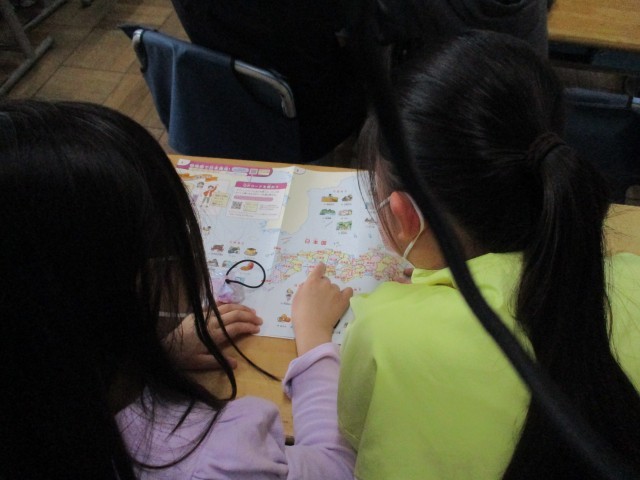 4年生では、名産品や形の特徴から、都道府県名を当てるクイズをしていました。