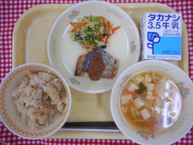 牛乳、たけのこご飯、魚の味噌焼き、しょうがあえ、若竹汁