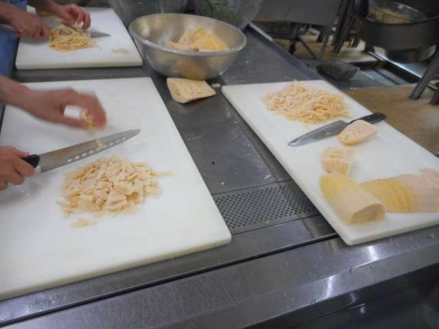 たけのこは、今が旬です。ほろ苦さと甘さを兼ね備え、シャキッと歯ごたえがいい食品です。また、食物繊維が豊富で、おなかの調子を整える働きがあります。きょうは、たけのこご飯と、若竹汁に入れました。魚は、あじを焼いて、味噌や砂糖、玉ねぎのすりおろしを入れたたれをかけました。甘辛い味噌だれが魚とよく合ったのか、低学年のクラスもおかわりじゃんけんが盛り上がっていました。旬の味を味わってもらえてよかったです。