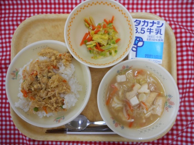 親子丼は、鶏肉と野菜を煮て、卵でとじたものをご飯をのせた丼です。にわとりと卵が親子なので、親子丼といいます。卵は300個ほど使いました!すべて調理員さんが手で割ってくださっています。野菜のレモン醤油あえは新メニューでしたが、さっぱりした味付けが口に合ったのか、普段野菜が苦手な子も美味しかった!とおかわりしてくれていて嬉しかったです♪