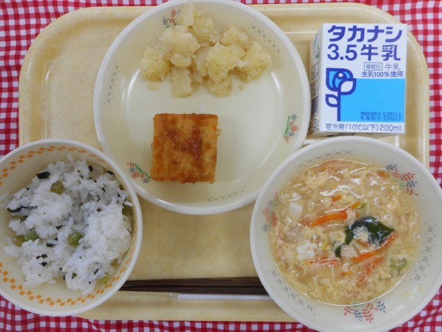 牛乳、わかめグリンピースご飯、豆腐の田楽風、新じゃがのごまこふきいも、かき玉汁