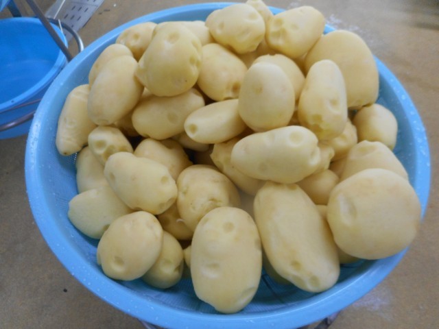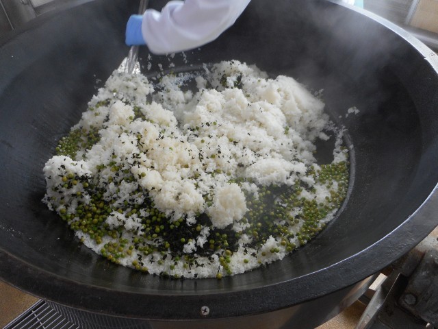 グリンピースは、冷凍したものを料理に使うことがほとんどですが、春の短い時期に、さやつきの生のグリンピースが出回ります。きょうは、その生のグリンピースを新鮮なままご飯に炊き込みました。わかめを入れて食べやすく工夫しました。今の季節が美味しい新じゃがは、こふきいもにしてほくほくに仕上げました。旬の味を味わってもらえてよかったです。