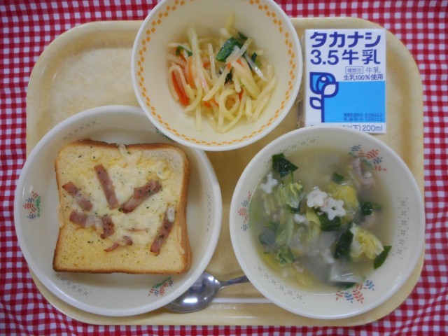 きょうの主食はクロックムッシュ風に仕上げたパンです。卵液にひたした後、ハム、チーズ、パセリをのせてオーブンで焼きました。レシピがほしい!という要望が多いほど好評でした。シャキシャキポテトサラダに使ったじゃがいもには、免疫力を高め、風邪をひきにくくするビタミンCが多く含まれています。スープには、星形の米粉マカロニを入れました。もちもちしてる!かわいい!と言いながら楽しそうに食べている様子が印象でした。