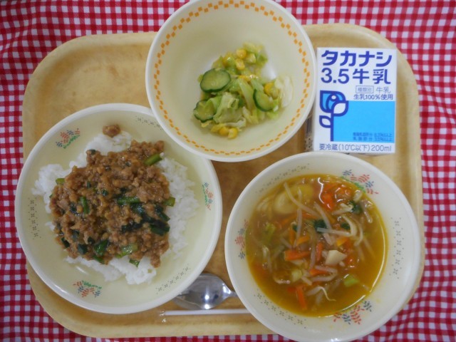 ソイ丼の具には、ぶた肉のほかに大豆ミートを入れました。大豆ミートとは、大豆を使って本物のお肉そっくりに作った食べ物のことです。お肉と同じ量のたんぱく質を摂ることができ、食物繊維も豊富です。カレー粉で味つけしたからかご飯がすすんだようで、きょうの料理の中で一番美味しかった!という子が多く、また残菜も少なくてよかったです!