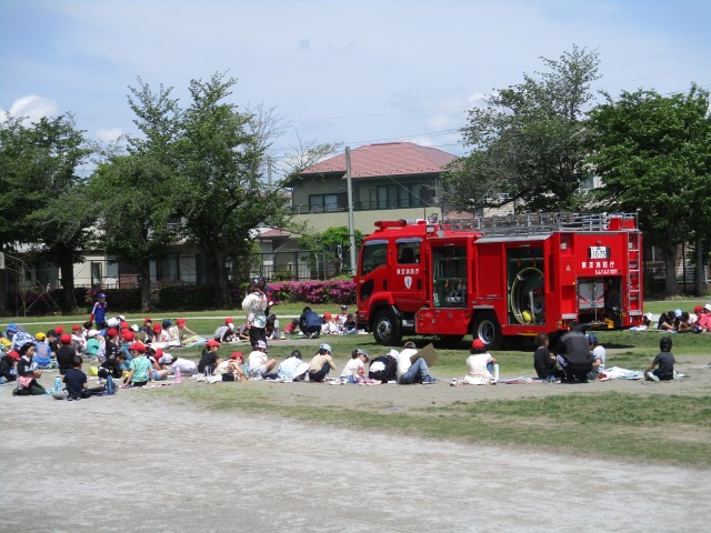 消防署の方々とともに、校庭の中央に消防車が到着しました。