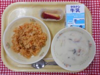 えびクリームソースは、ベーコン、玉ねぎ、にんじん、しめじなどを炒めたあと、えび、豆乳、いんげんまめのペーストを加えて米粉でとろみをつけています。カレー味のごはんに豚肉や玉ねぎ、にんじん、マッシュルームなどを混ぜ合わせて作ったカレーピラフとの相性は抜群です。職員室で余ったピラフとクリームソースをこの日は2年生がすべて食べてくれました!夏休みを経て7月よりもたくさん食べられるようになったと感じ、成長している姿が見られて嬉しいです。