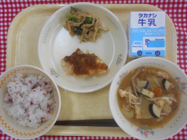 牛乳、梅しらすごはん、魚のバーベキューソースかけ、わかめ入りおひたし、利休汁