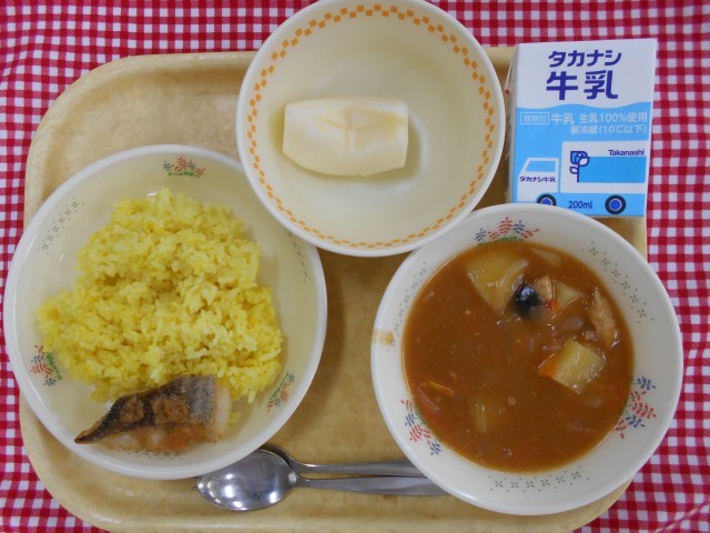 牛乳、ターメリックライス、たらのエスカベジェ、鶏のトマトシチュー、くだもの(りんご)