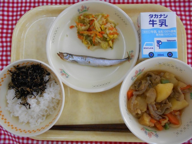 牛乳、ごはん、ひじきのふりかけ、焼きししゃも、野菜炒め、カレー肉じゃが